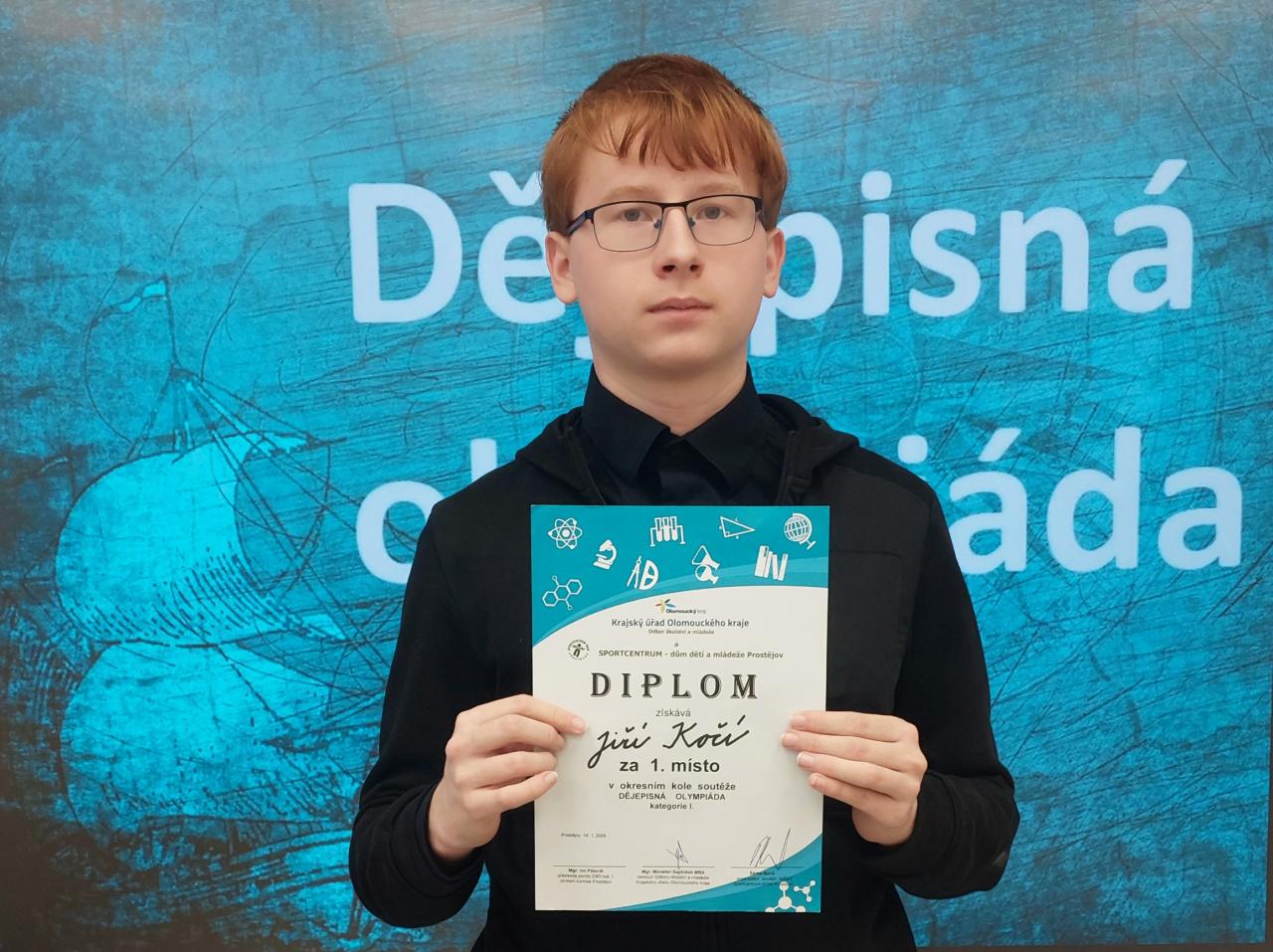 Letošní ročník olympiády opět prověřil nejen faktické znalosti soutěžících, ale i schopnost pracovat s historickými prameny, a především zájem o naši minulost. Jirka jako vítěz postupuje do krajského kola, kde mu budeme držet palce. Zároveň mu všichni děkujeme za úžasnou reprezentaci školy.