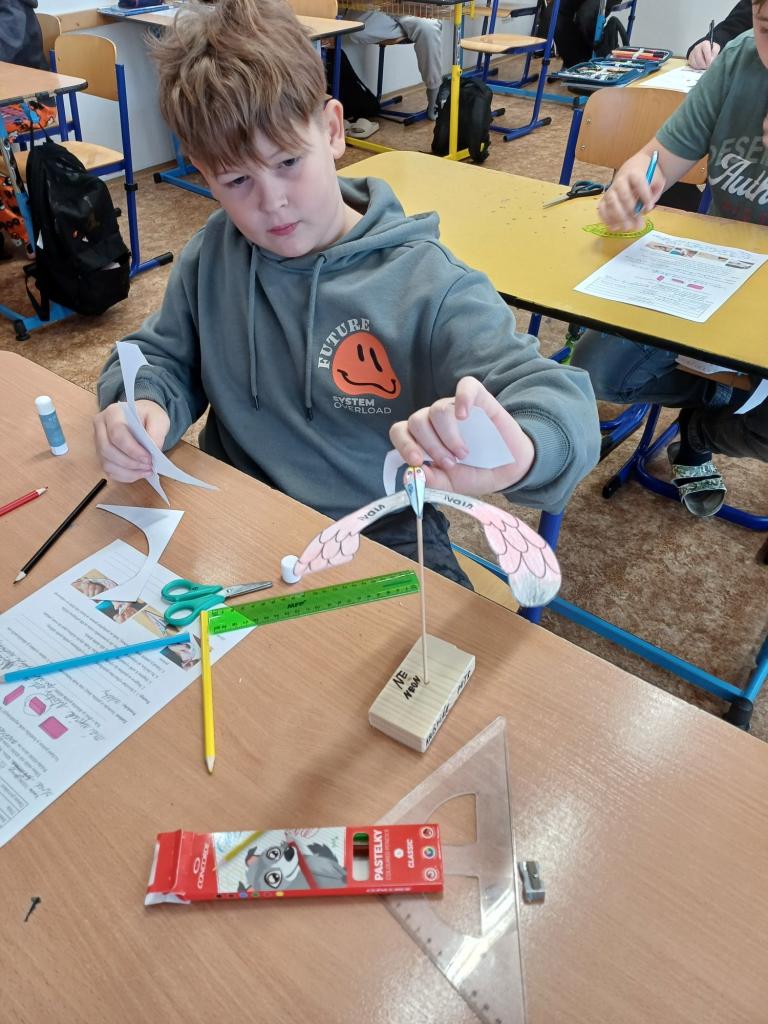 V rámci projektu „Fyzika hravě“ se pustili do tvorby modelu ptáčka. Úkolem bylo nejen vytvořit estetický výrobek, ale především využít znalosti o těžišti a jeho vlivu na stabilitu. Žáci zkoumali, jak správně model vyvážit, aby se ptáček udržel v rovnováze na ocásku. Díky tomu si prakticky ověřili, že teorie z učebnice má své místo i v reálném světě. Výsledkem byly originální modely, které nejen dobře vypadaly, ale také perfektně fungovaly. Hodina ukázala, že fyzika není jen o vzorcích – může být kreativní, zábavná a plná překvapení!