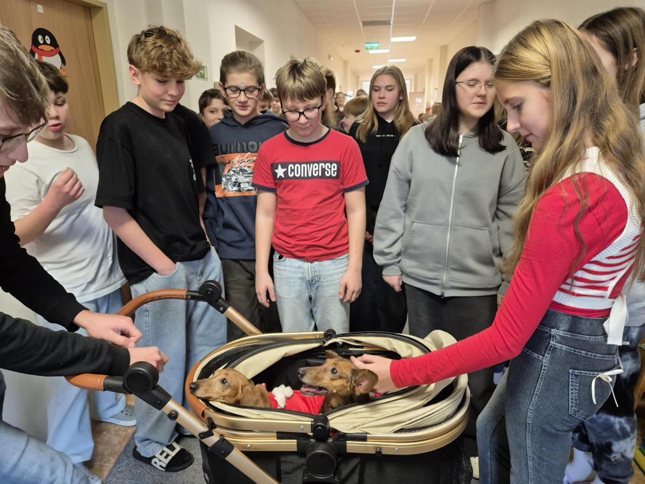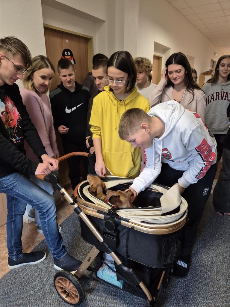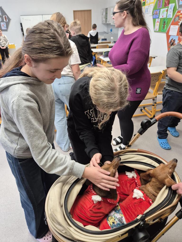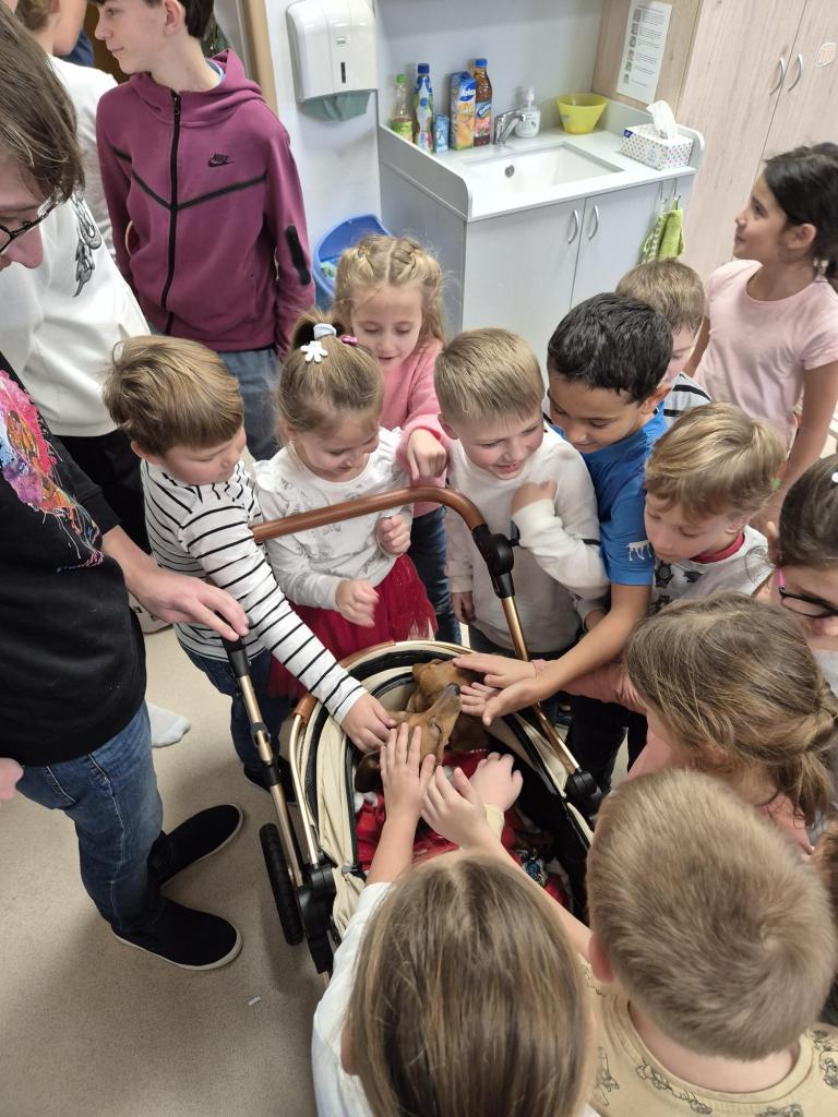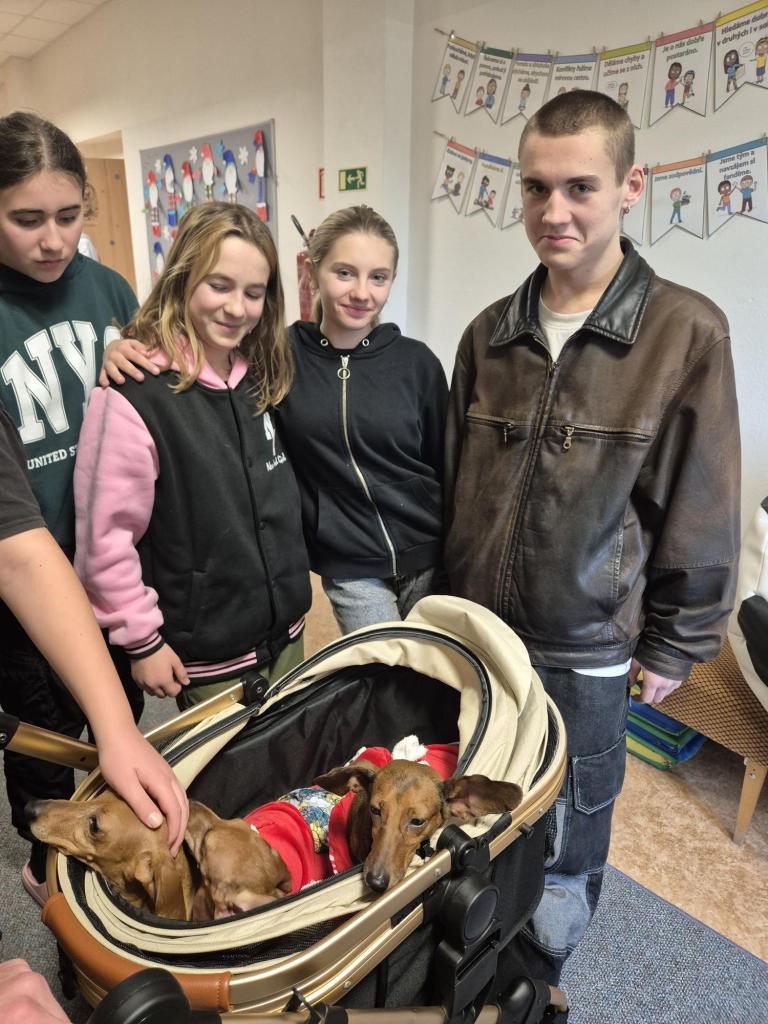 Tato organizace se věnuje pomoci jezevčíkům, kteří se ocitli v tíživé situaci – ať už byli opuštěni, týráni nebo mají zdravotní problémy. Díky štědrosti našich žáků, rodičů a zaměstnanců se sešlo mnoho užitečných věcí a také částka 2 060 Kč v hotovosti. Nasbírané věci si přijel vyzvednout pan Lukáš z organizace, který s sebou přivezl tři zachráněné jezevčíky. Všichni tři pejsci byli ochrnutí na zadní část těla. Žáci měli možnost si pejsky pohladit, dozvědět se více o jejich příbězích a o tom, jak organizace funguje. Moc děkujeme všem, kteří se do sbírky zapojili, a pomohli tak těm, kteří naši pomoc potřebují!