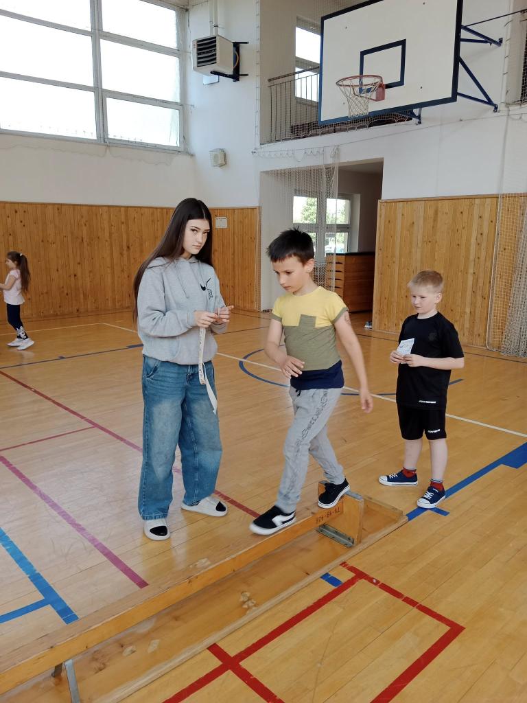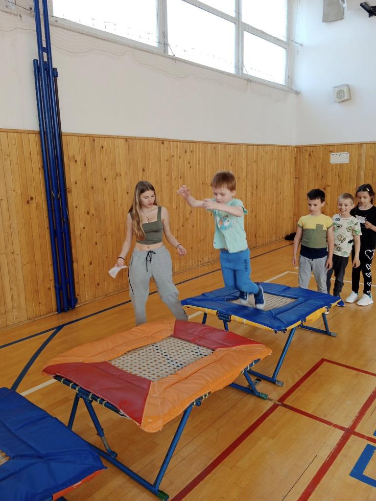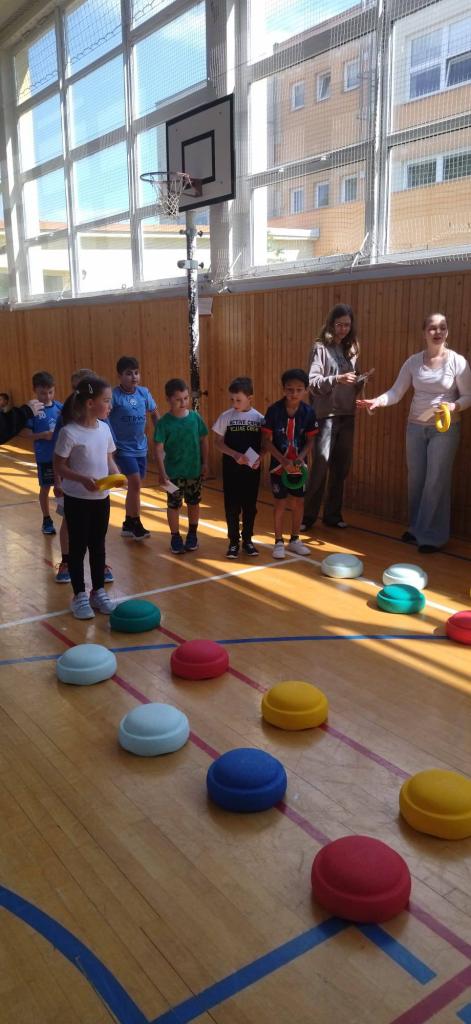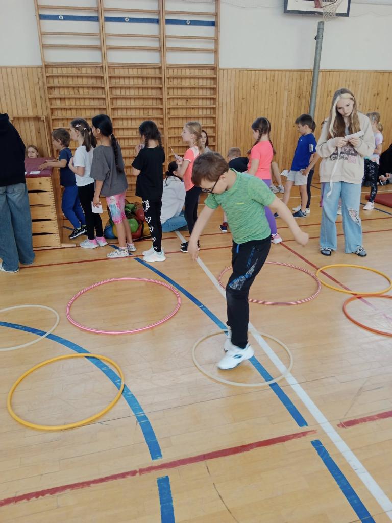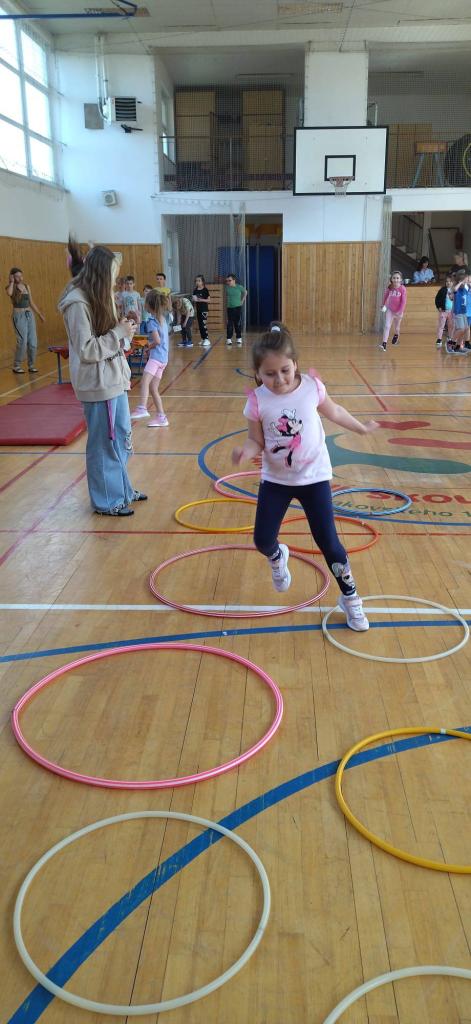Všichni s velkým nadšením běhali, skákali, házeli ,houpali se na kruzích....Za splnění každé sportovní disciplíny dostali do kartičky nálepku. Hodina se všem líbila